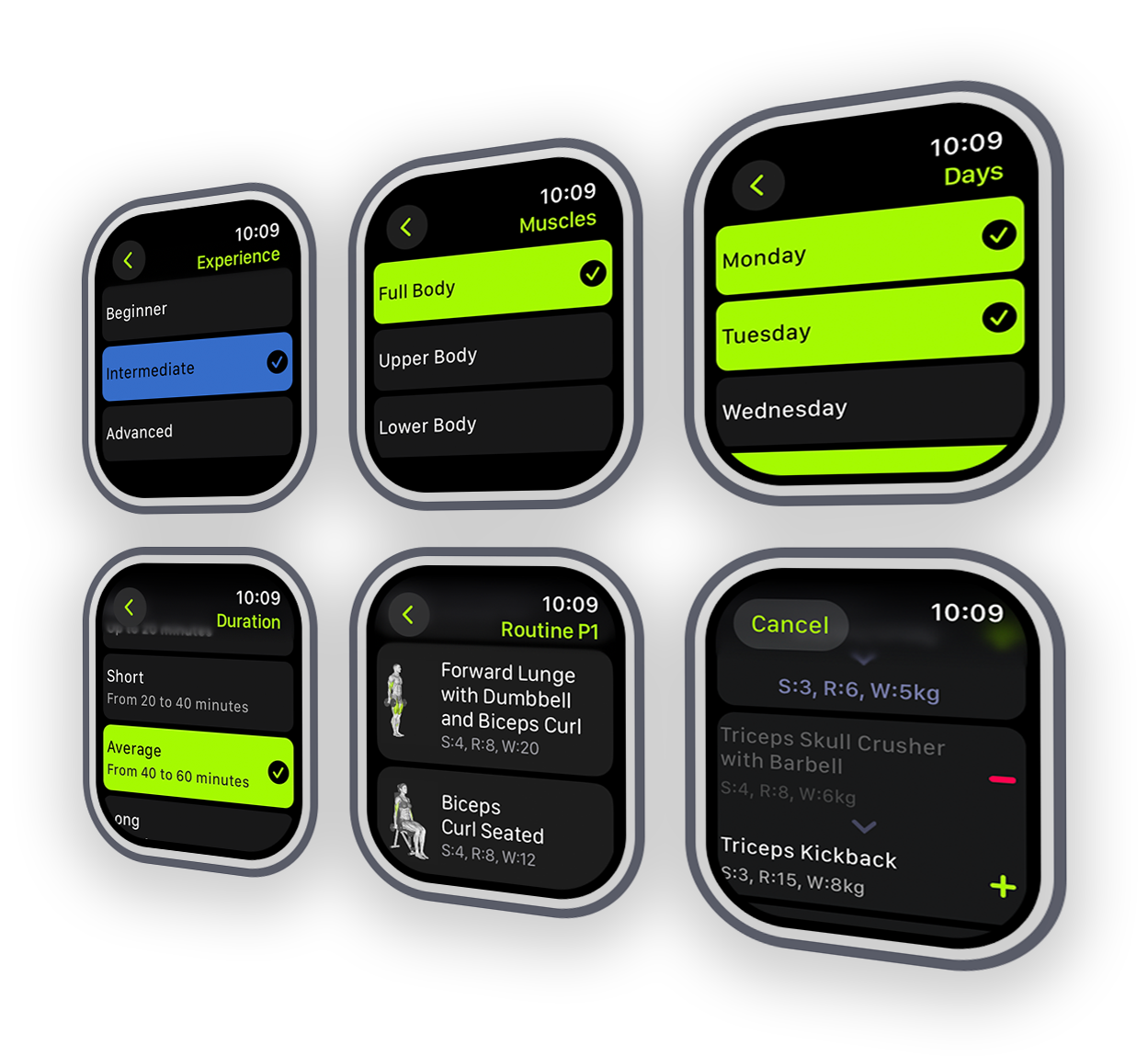 Smart Trainer is our Artificial Intelligence that is able to create personalized routines, based on your preferences and equipment you have around. It will also track your workouts, and suggest changes as you progress. All this from your wrist! No iPhone required!