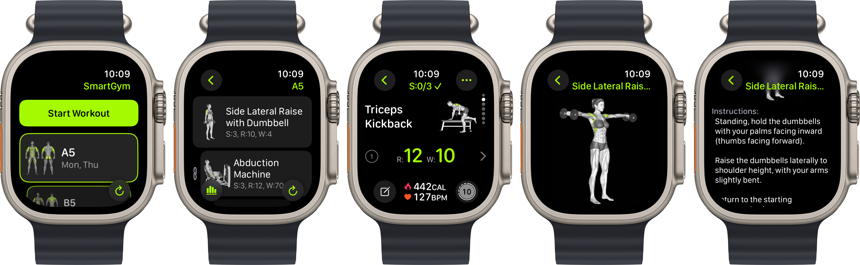 SmartGym leverages the Apple Watch Ultra Action Button in a truly unique way. Through intelligent background math, it predicts your next action, making this button entirely dynamic. Every time you tap it, it seamlessly guides you to the next step, whether it's starting a rest timer, logging a new set, moving to the next exercise, or even concluding your workout.
